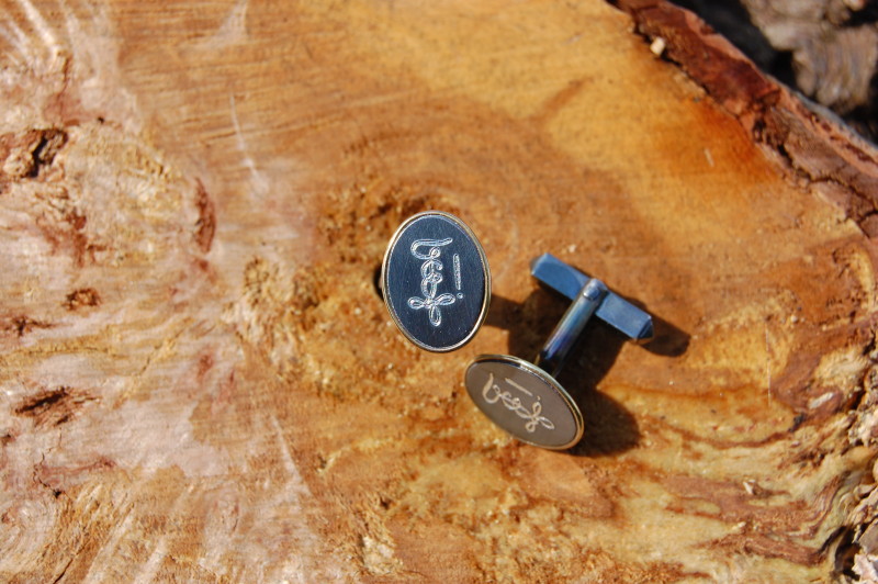 Manschettenknöpfe Die Manschettenknöpfe sind aus geschwärztem Silber mit einem Rand in 750er Gelbgold. Die Manschettenknöpfe können nach Kundenwunsch graviert werden.